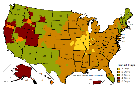 Our distribution facility is located in Missouri, so most shipments should arrive to you within 3-4 business days of being shipped. Please see the shipping times map below to verify approximate ship time to your state. All orders are processed in the order received. Our team will do our best to process all orders as quickly as possible.